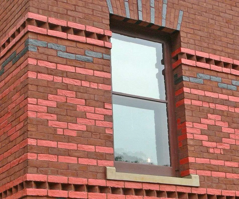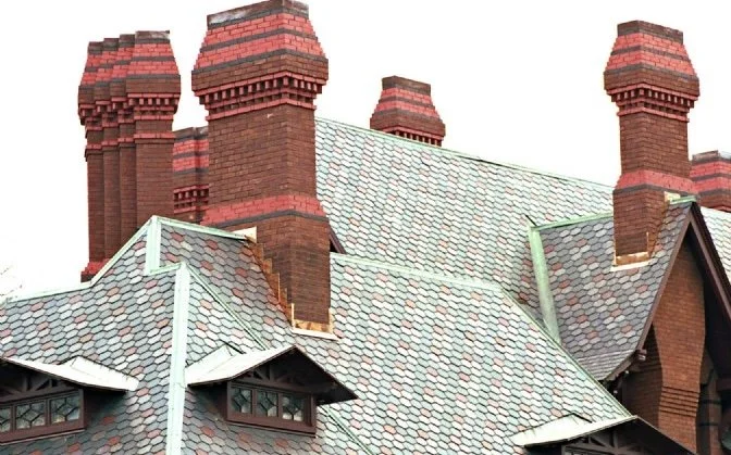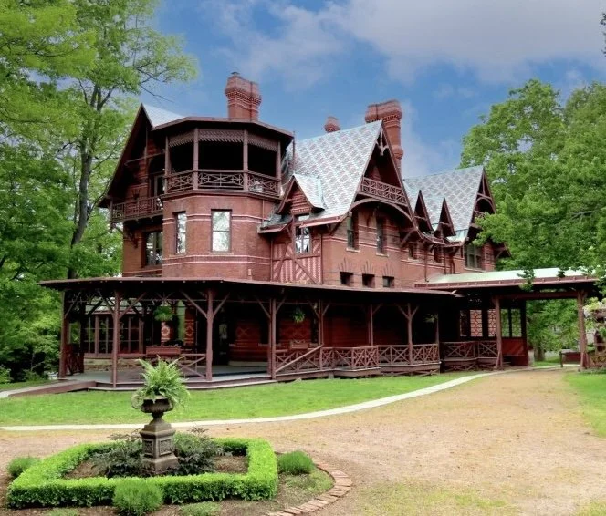 Potter uses the shape and pattern of the roof and brickwork at the Mark Twain House & Museum in Hartford, Connecticut. Edward Tuckerman Potter was the architect that designed the home built by Samuel Clemens.