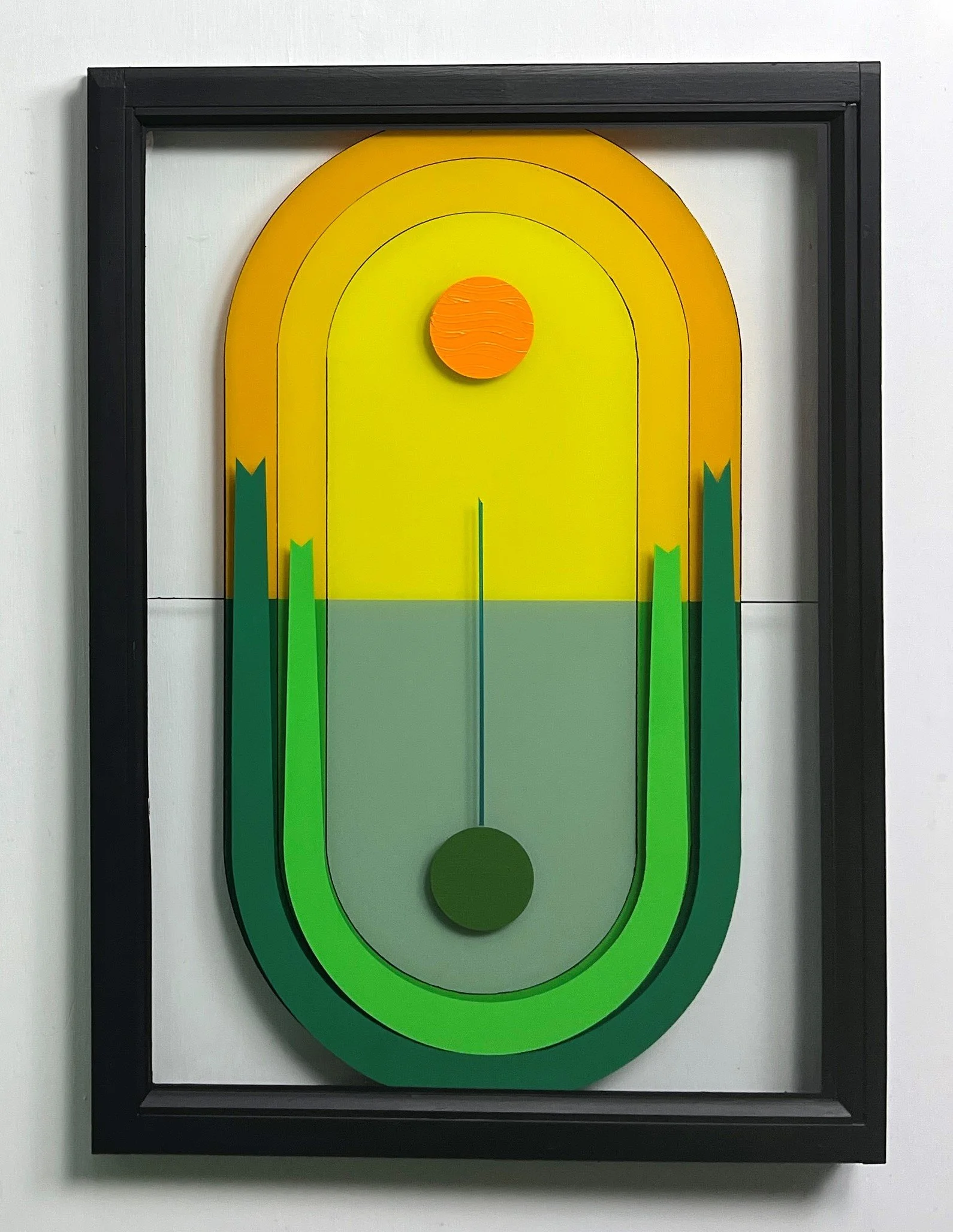 From the artist: If you start looking, you would be surprised how many windows you find lying by the side of the road. I am an abstract artist, working primarily with reclaimed house windows as my canvas. My journey into art began relatively late, in 2018, after years of practicing law. The pivot to art came unexpectedly, inspired by a simple experiment with an antique window that had long sat untouched in my kitchen. Recycled windows have become my primary medium, offering a unique canvas for the bold colors and geometric patterns that characterize my work. I am continually fascinated by the interplay between matte and glossy surfaces, exploring both the reverse and foreground of the glass to create layered, semi-representational compositions.