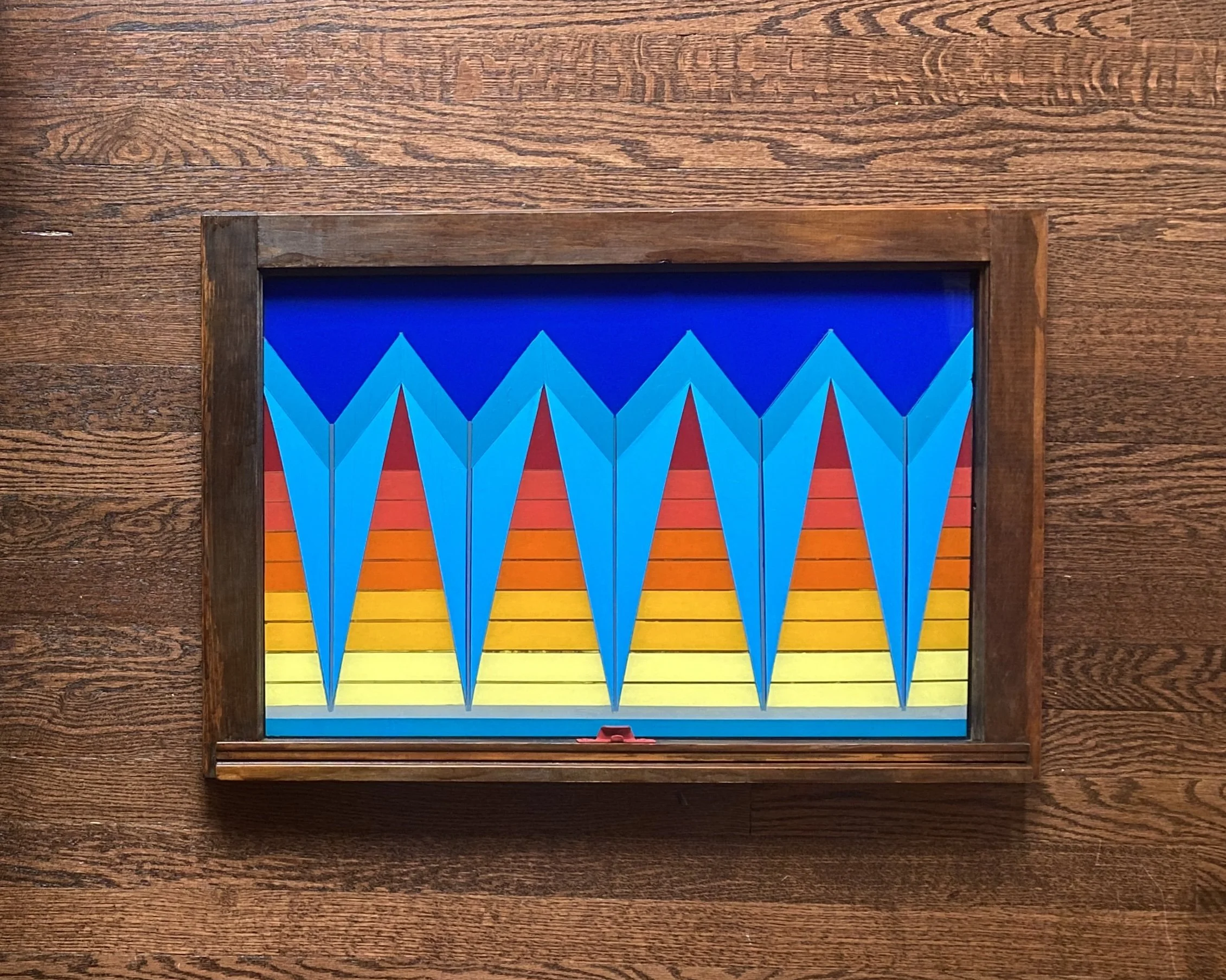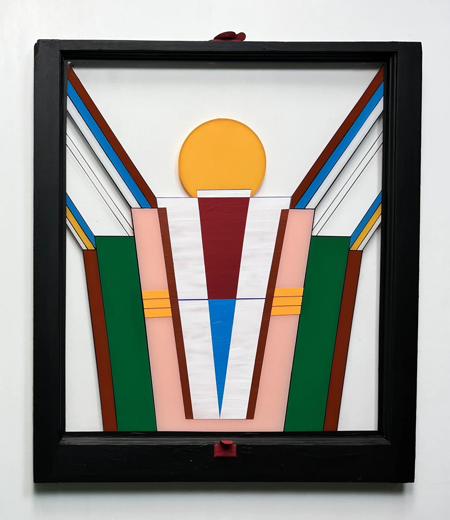 After an experiment with an antique window hanging untouched in my kitchen for years, I found myself returning to the visuals I could achieve with acrylic paints on the reverse of recycled windows. In this medium, I saw an ideal presentation for bold colors and geometric patterns.