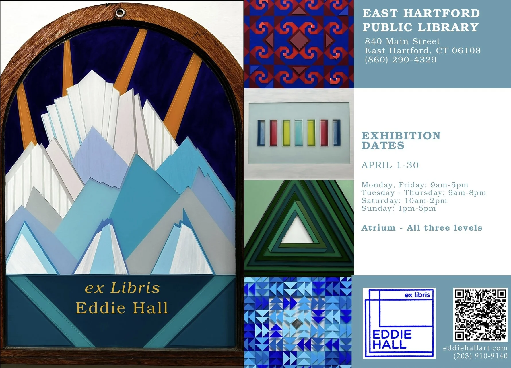 Eddie Hall is a self-taught abstract artist based in Berlin, Connecticut, known for creating vibrant, geometric works using recycled windows as his canvas. Drawing inspiration from architecture and design, his art transforms discarded materials into bold visual narratives. Hall is a member of the Kehler Liddell Gallery and the Silvermine Guild of Artists, and his work has been featured in solo and group exhibitions at institutions including the New Britain Museum of American Art, Mattatuck Museum, Hill-Stead Museum, Mystic Museum of Art, Edward Hopper House Museum, Slater Memorial Museum, Scope Miami, and many others. His work is held in the permanent collection of the New Britain Museum of American Art and Central Connecticut State University and currently on display at the Connecticut State Capitol Building. Hall is currently pursuing the impossible goal of exhibiting at every library with a gallery in Connecticut.